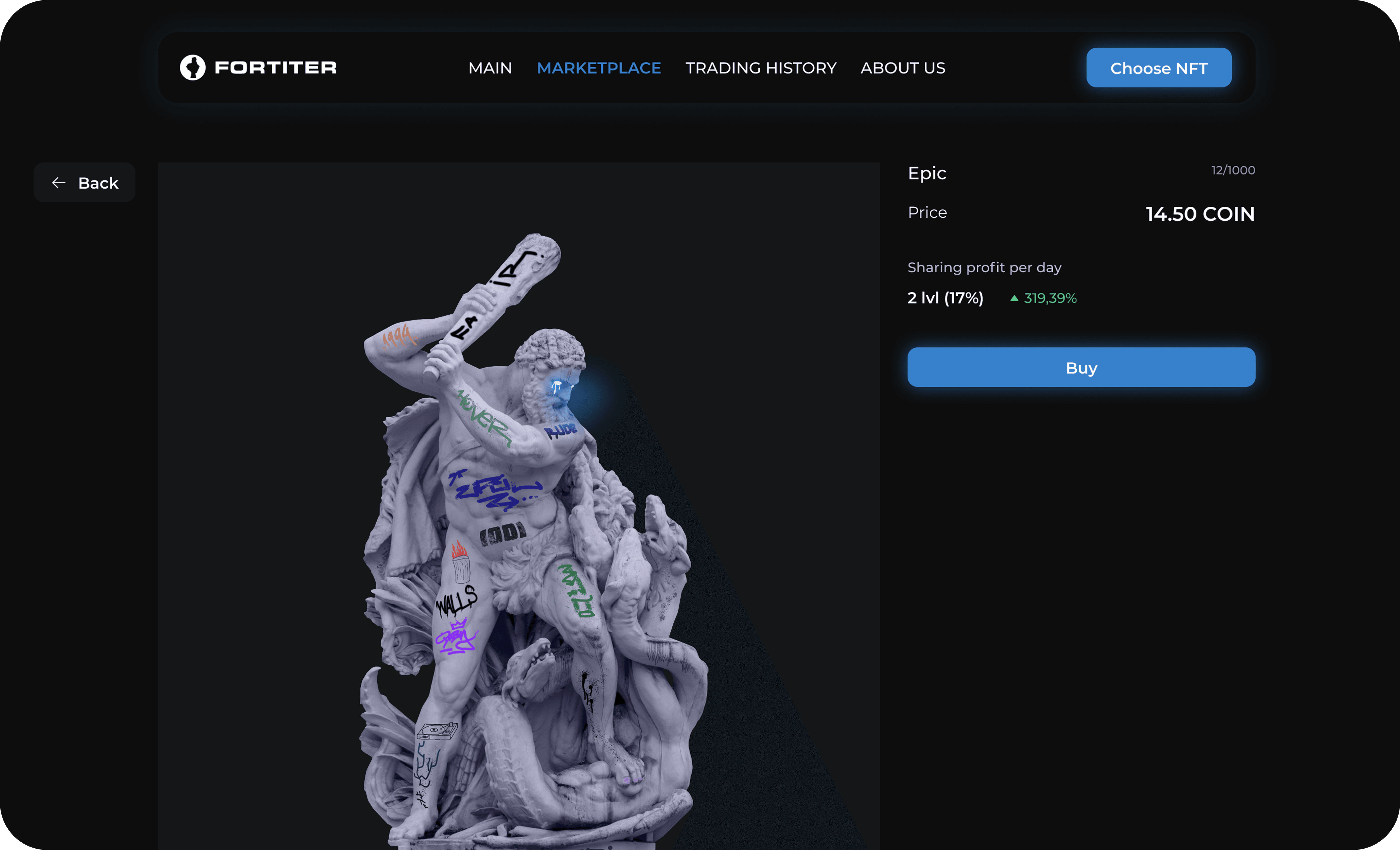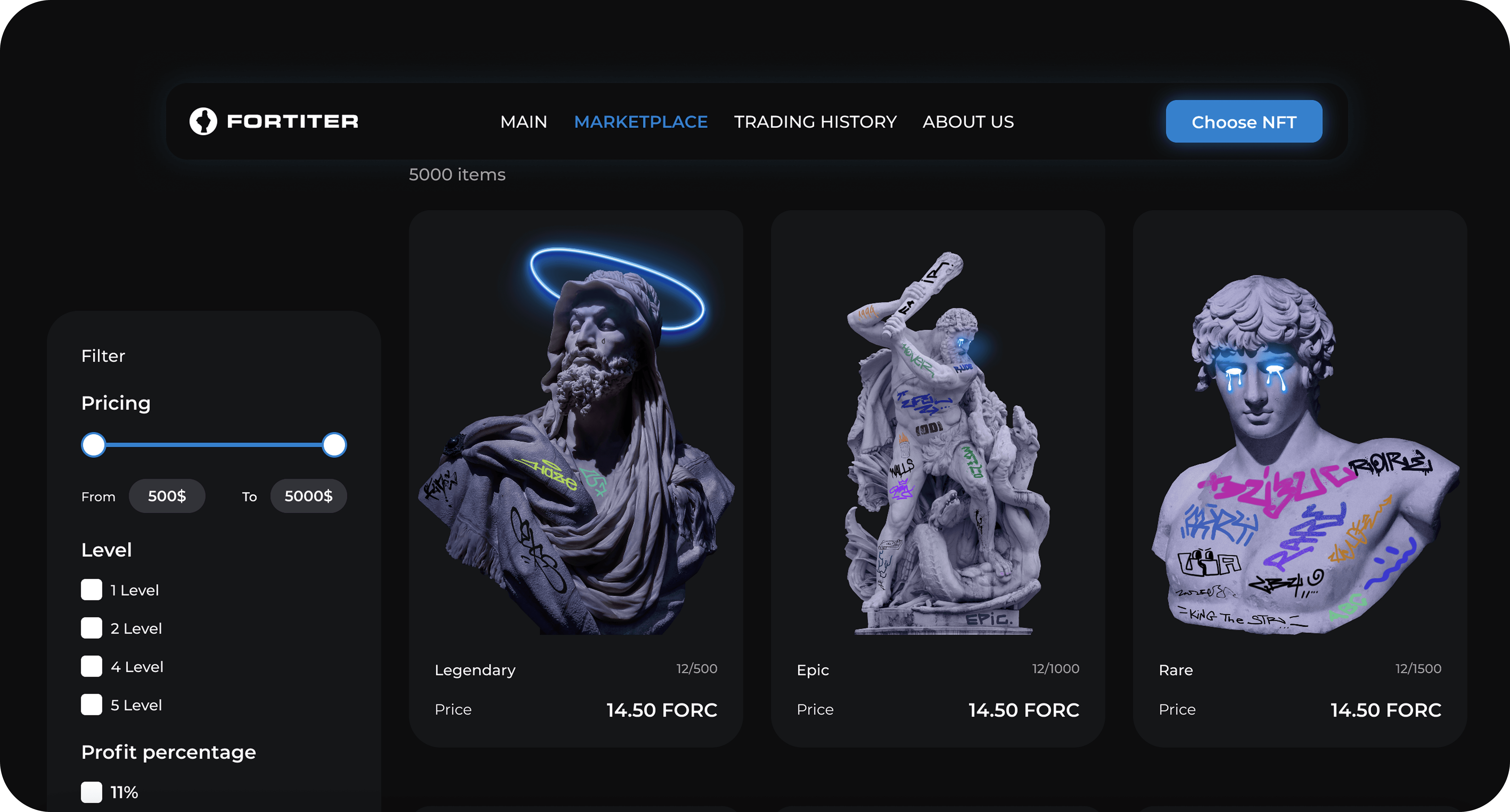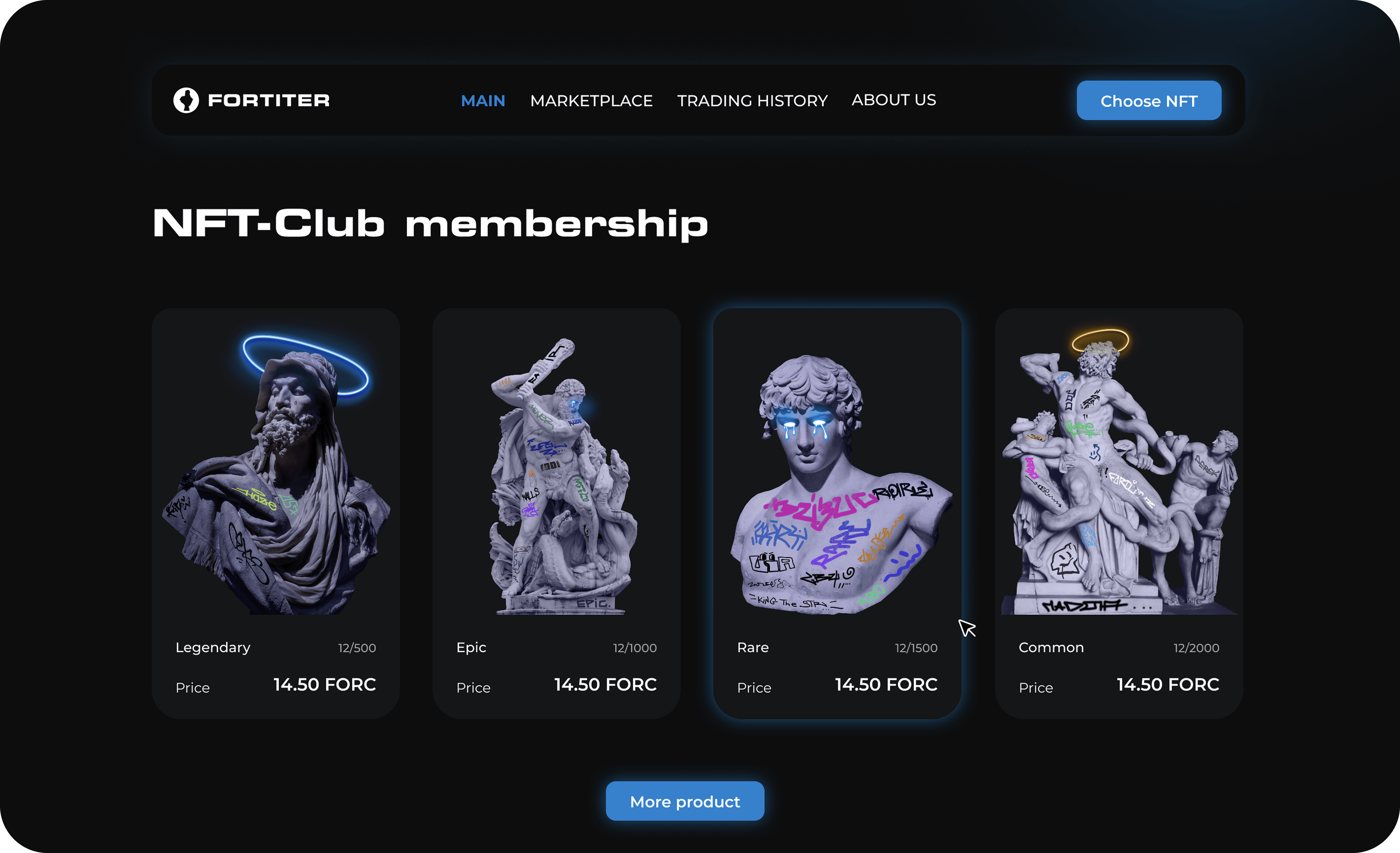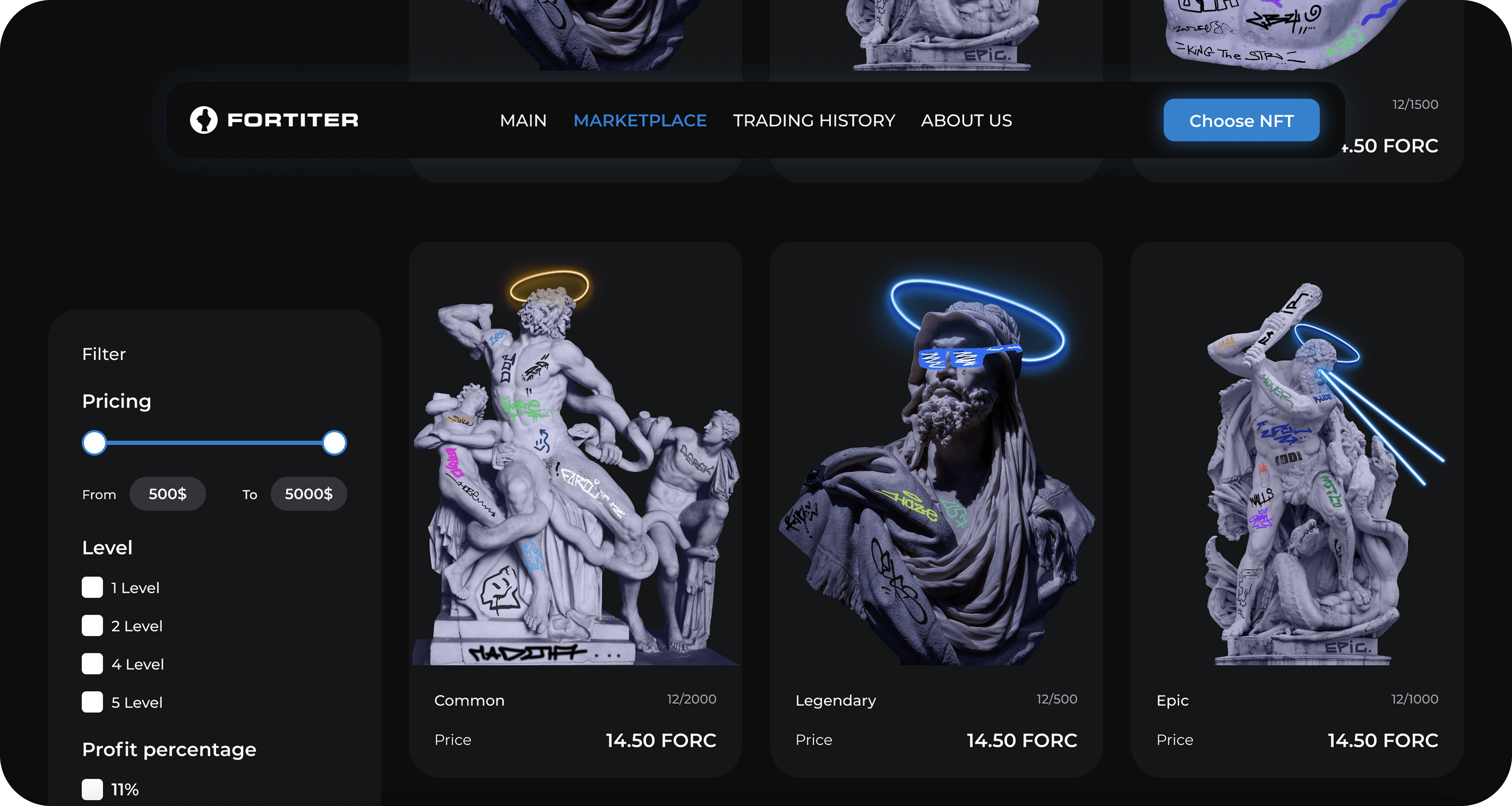Fortiter needed a marketplace that supports NFT trading flows with wallet connectivity, rarity filtering, ownership data viewing, and weekly revenue distribution tracking. Transaction status must be clear so that users understand what is happening when they sign, confirm, or reject an action on the blockchain. Our task was to create user paths that were stable and consistent with their membership model.
