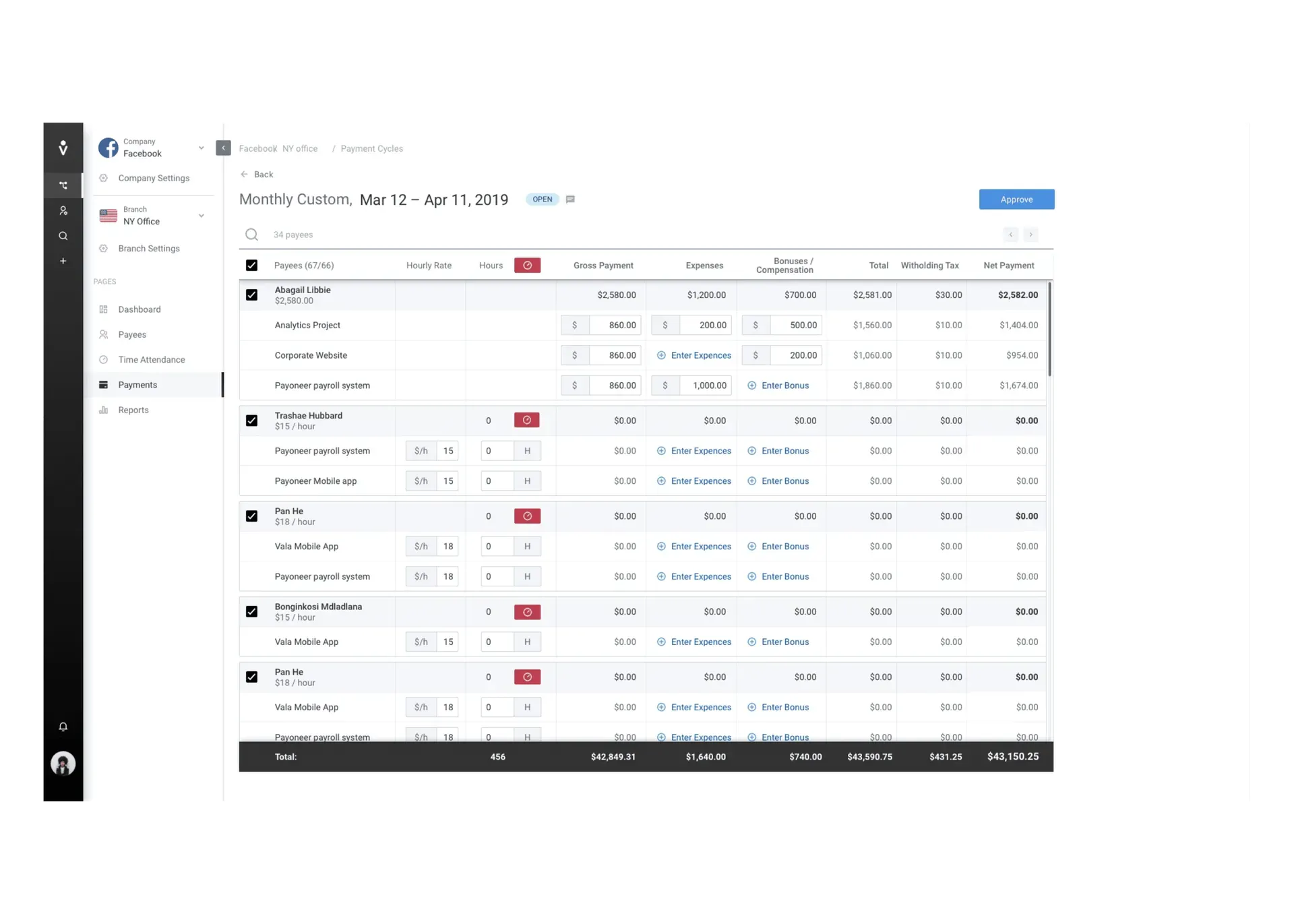 Finance teams can add payees, define payment details, attach required documents, and associate them with projects or departments. This ensures clean data preparation before payroll execution and simplifies compliance checks.