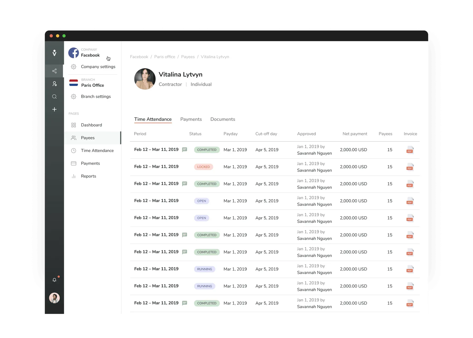 The system allows administrators to review approved hours, adjust rates, include bonuses or expenses, and select payees for each cycle. Payroll can then be executed based on predefined schedules, with invoice downloads and full audit visibility for each transaction.