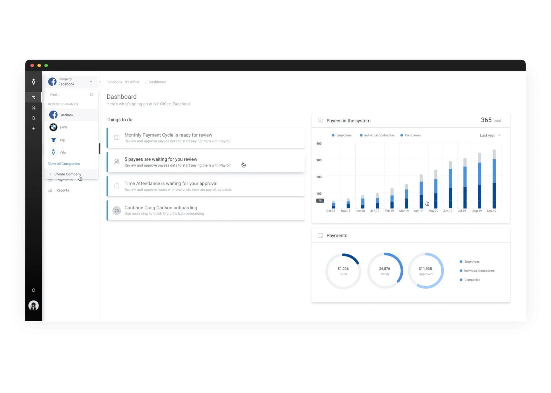 Administrators can create and manage companies, define payment cycles, set up projects and departments, and configure branch details. The dashboard centralizes payroll operations, so finance teams have full visibility over organizational structure and payment schedules.