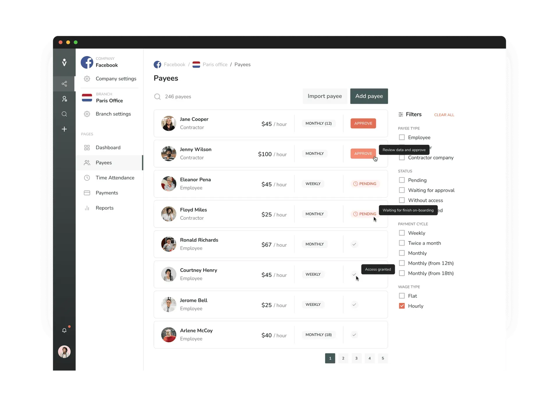 The platform supports structured user management with clearly defined roles and permissions. Administrators can assign access levels, manage personal data, and control who can approve hours, manage payees, or trigger payroll cycles.