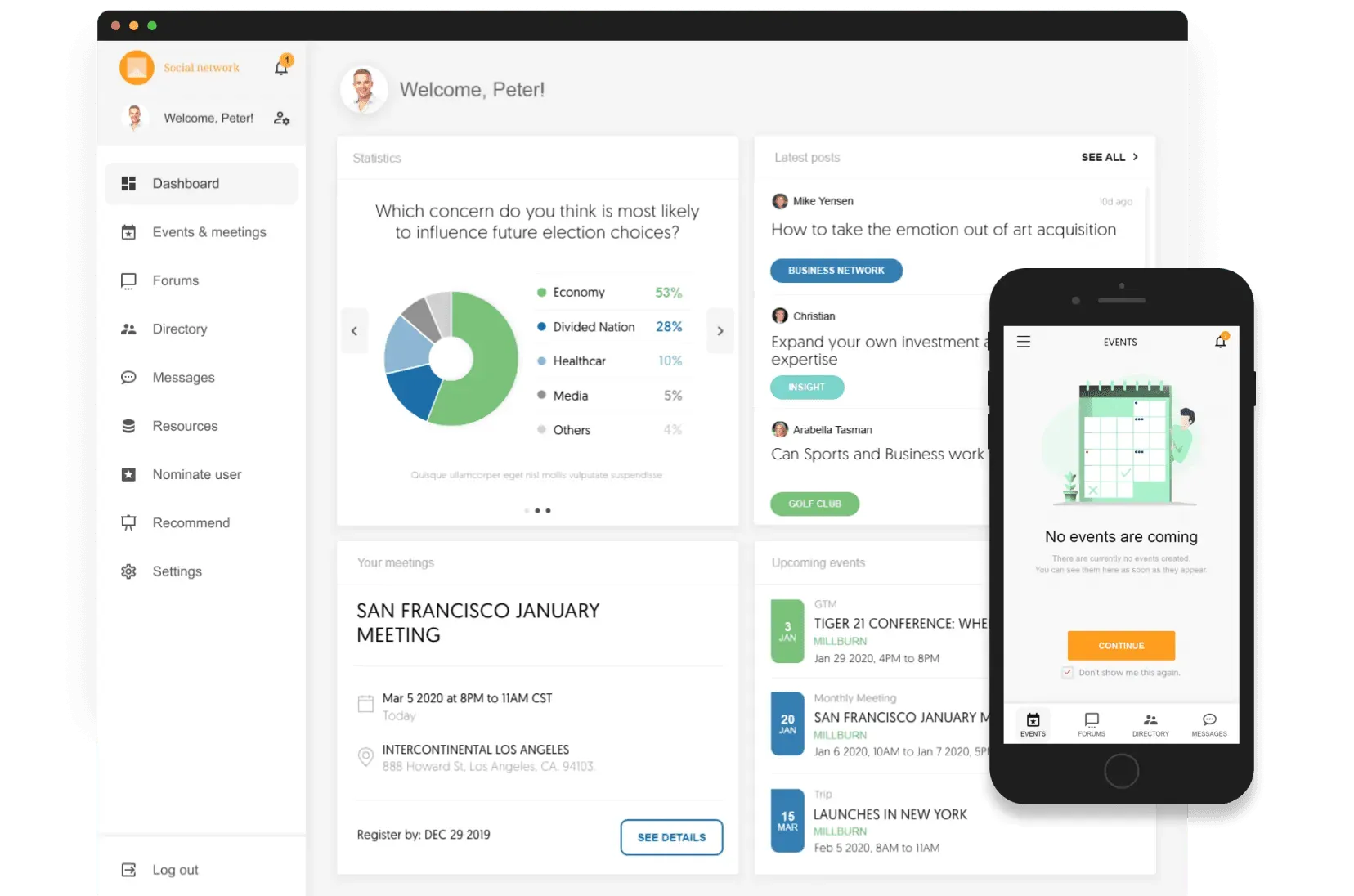 The client needed an online platform to simplify interaction within their private business community. The system had to help members find relevant contacts, organize regional events, schedule meetings, share relevant insights, and create new partnerships. The goal was to replace fragmented communication channels with one reliable environment for networking and collaboration.